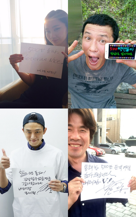 한편 500만 돌파를 기념해 '베테랑'의 주연 배우들이 관객들에게 감사의 인사와 인증샷을 전해 시선을 끈다. 관객들의 가슴을 뻥 뚫어주는 명불허전의 명품 연기로 뜨거운 호평을 모으고 있는 황정민은 "500만 돌파, 진심으로 감사해요", 한국 영화 최고의 악역이라는 평가를 받고 있는 유아인은 "500만 돌파! 감당할 수 없을 만큼 감사합니다. '베테랑' 파이팅!", 오팀장 역의 오달수는 "통쾌한 500만 관객 여러분 감사 드립니다. '베테랑' V!", 미스 봉 역의 장윤주는 영화 속 대사 "미스 봉 나이스!"를 패러디한 "베테랑 나이스!"라는 재치 있는 멘트와 기분 좋은 인증샷으로 유쾌한 웃음을 전한다.