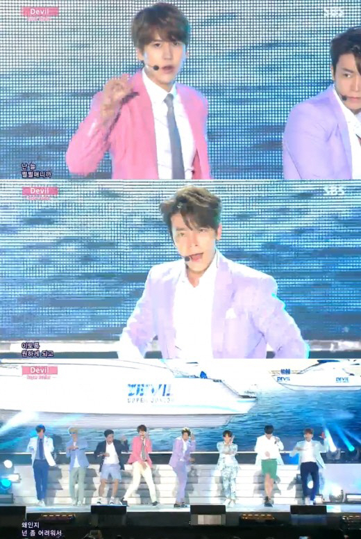 이날 방송에서 슈퍼주니어는 히트곡 '데빌'을 열창하며 완벽한 칼군무를 펼쳤다.
