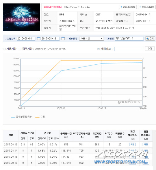 파이널판타지14의 PC방 기록은 리니지, 블레이드앤소울과 비교할 수 있을 정도의 수치이며, 유저 체류시간은 2시간을 넘겨 캐주얼게임에 비해 높은 수치를 나타냈다.