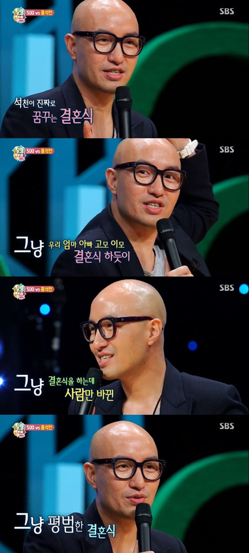 이날 홍석천은 "부모님이 하시던 것처럼 촌스러운 인테리어에 뒤에 주례선생님이 계시는 결혼식을 하는데 제 신부될 친구 그 자리가 양복을 입은 그것만 바뀌는 걸 뿐 평범한 결혼을 하고 싶다"며 결혼에 대해 언급했다.
