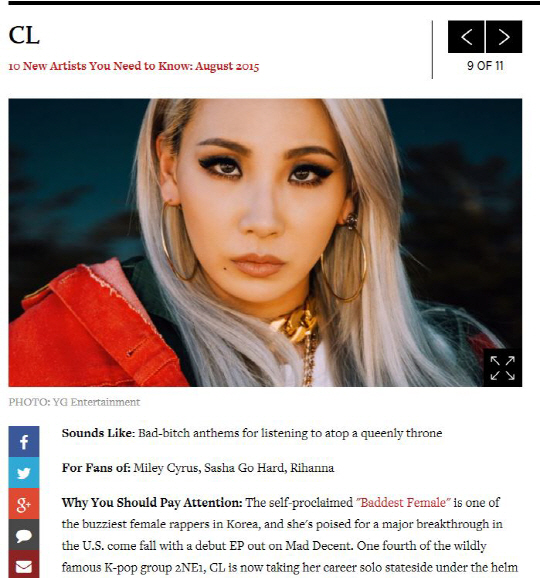 지난 17일(현지시각) '롤링 스톤'은 "최근 차트 혹은 온라인을 뜨겁게 달구고 있는 10명의 핫한 아티스트를 소개하고자 한다"며 10명의 리스트를 공개했다. 씨엘은 트래비스 밀스, 스노 앨레그라, 부기, 콜드 비트 등과 함께 이름을 올렸다.