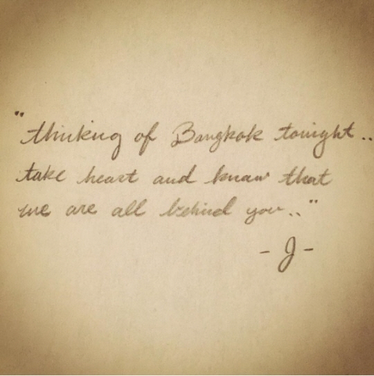 사진 속에는 제시카 본인이 자필로 쓴 글이 담겨져 있었다. 자필 편지 속에는 "오늘 밤 방콕을 생각하며…우리가 항상 당신들 뒤에 있다는 것을 알아달라"라는 글로 태국과 희생자들을 응원했다.
