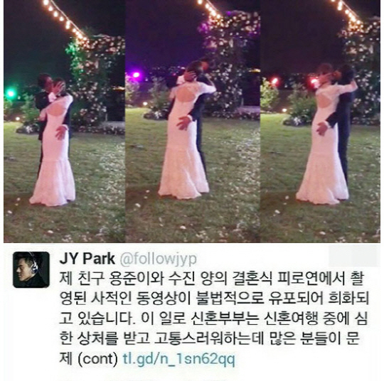 그러나 이와 관련 배용준의 절친한 친구인 박진영은 31일 자신의 트위터에 "제 친구 용준이와 수진 양의 결혼식 피로연에서 촬영된 사적인 동영상이 불법적으로 유포되어 희화되고 있습니다"며 불편한 심경을 전했다.