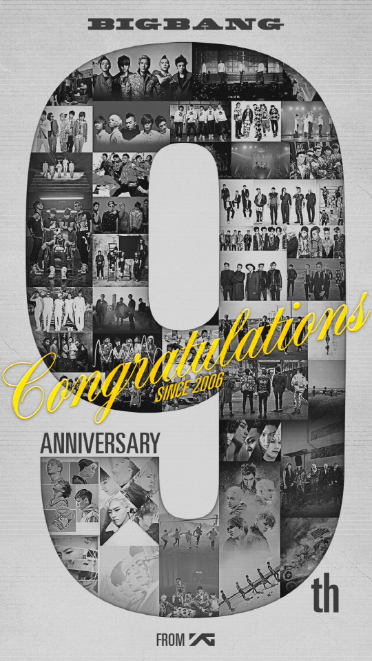 공개된 이미지에는 'BIGBANG 9th ANNIVERSARY'라는 문구와 함께 빅뱅을 상징하는 노란색 글씨로 'Congratulations SINCE 2006'이라고 새겨져 있다. 또 초대형 숫자 '9'안에는 그간 빅뱅이 발표한 앨범 재킷 이미지 등이 고스란히 담겨있어 지난 9년간의 추억들을 새록새록 떠올리게 했다.