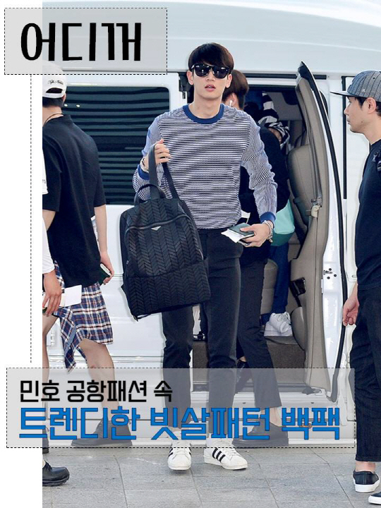 [어디꺼] 민호 공항패션 속 빗살무늬 독특한 블랙백팩?