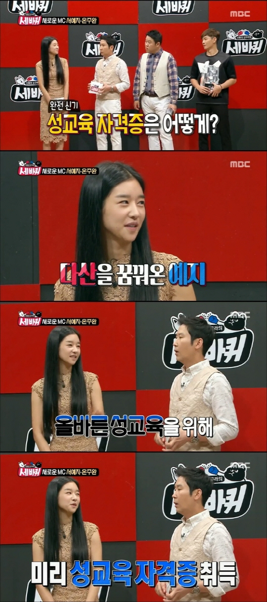 이날 서예지는 "예능프로그램 출연 경력 별로 없다"고 걱정을 쏟아냈고, 신동엽은 "특이한 경력 있다. 성교육 자격증이 있다더라"라며 자연스럽게 이어나갔다.
