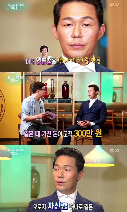 박성웅은 "결혼할 때 딱 300만원이 있었다. 무대포 정신이었던 것 같다"며 "그래도 나는 자신이 있었다. '안 굶길 자신이 있다'고 했더니 아내도 '알았다'고 했다"고 당시 상황을 전했다.