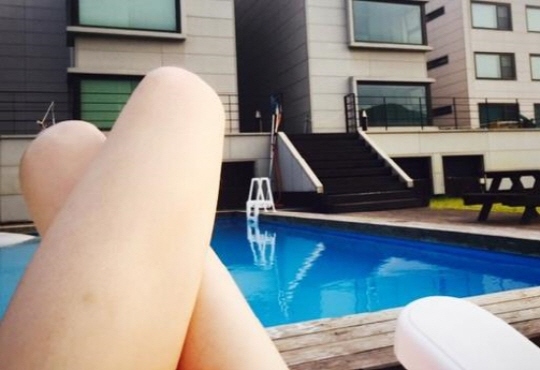 공개된 사진 속에는 이혜정이 수영장 한 편에 앉아 다리를 꼰 채 휴식을 취하고 있는 모습이 담겼다.