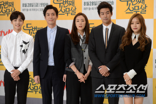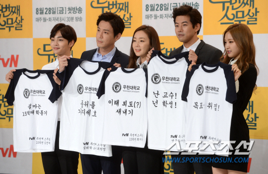 tvN 새 금토 드라마 '두번째 스무살' 제작발표회가 25일 서울 영등포 타임스퀘어 아모리스홀에서 열렸다. 김민재 최원영 최지우 이상윤 손나은(왼쪽부터)이 포즈를 취하고 있다. '두번째 스무살'은 꽃다운 19세에 덜컥 엄마가 되어 살아온 지 20년이 된 하노라(최지우 분)가 대학에 입학해 난생처음 캠퍼스 라이프를 겪는 이야기를 담은 드라마다. 오는 28일 오후 8시 30분 첫 방송된다. 허상욱 기자 wook@sportschosun.com/2015.08.25/