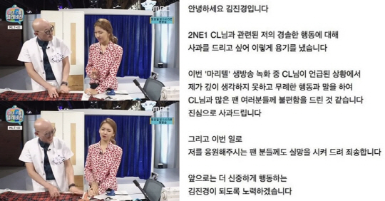김진경은 27일 자신의 인스타그램에 "2NE1 CL님과 관련된 저의 경솔한 행동에 대해 사과를 드리고 싶어 이렇게 용기를 냈다"며 "이번 '마리텔' 생방송 녹화 중 CL님이 언급된 상황에서 제가 깊이 생각하지 못하고 무례한 행동과 말을 하여 CL님과 많은 팬 여러분들께 불편함을 드린 것 같다. 진심으로 사과드린다"고 밝혔다.