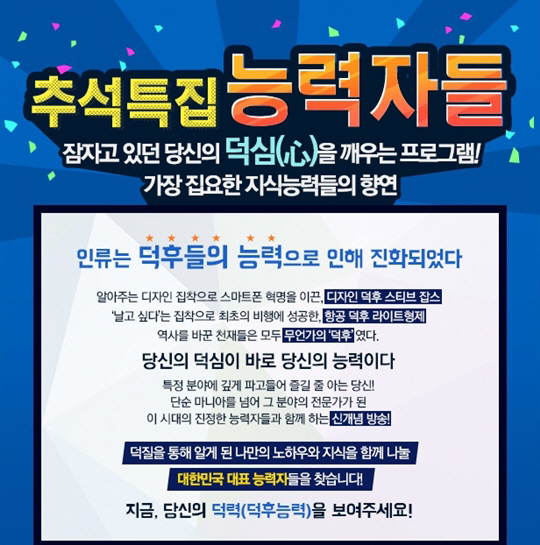 이어 "장르 불문, 덕질을 통해 알게 된 '나만의 노하우'와 지식을 함께 나눌 '덕심'이 충만한 숨은 '능력자들'을 찾는다"며 단순한 마니아를 넘어 그 분야의 전문가가 된 사람들의 적극적인 참여를 독려했다.