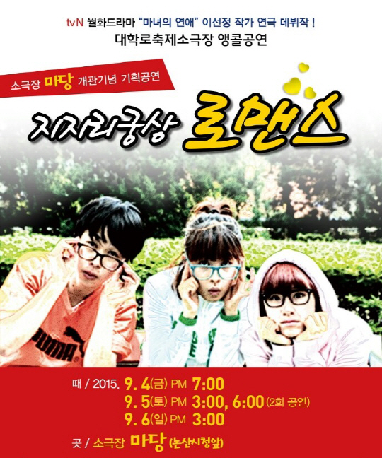 [스포츠조선 고재완 기자] 로맨틱 코미디 연극 '지지리궁상 로맨스'가 내달 4일부터 6일까지 3일간 충남 논산시 소극장 '마당'에서 공연한다.