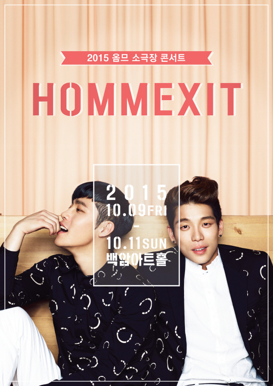 2AM 이창민과 에이트(8eight) 이현의 프로젝트 그룹 '옴므'는 오는 10월 9일부터 11일까지 총 3일 간 소극장 콘서트 'HOMMEXIT'를 개최하고 팬들과 만난다.