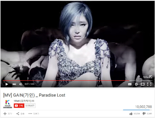 가수 가인의 '파라다이스 로스트(Paradise Lost)' 뮤직비디오가 1000만 조회수를 돌파했다.