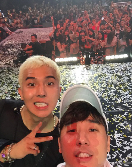 사진 속 베이식은 준우승자 송민호와 함께 '쇼미더머니4' 무대 위에서 포즈를 취하고 있는 모습. 베이식은 카메라를 응시했고, 송민호는 베이식의 뒤에서 손으로 브이(V)를 그리며 개구진 표정을 지었다.