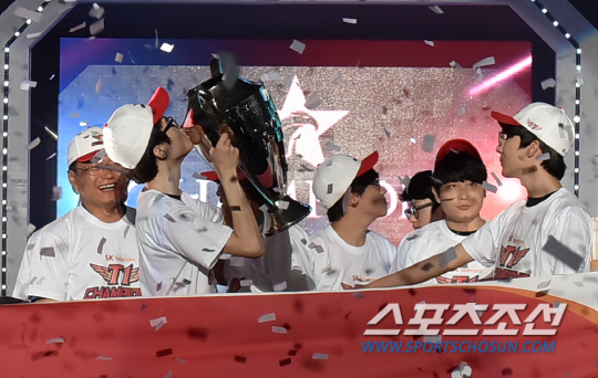 ◇29일 열린 '2015 스베누 LoL 챔피언스 코리아' 서머 시즌 결승전에서 우승을 차지한 SKT T1 선수들이 기쁨을 만끽하고 있다. 사진제공=OGN