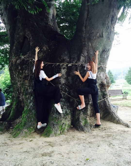 사진 속 홍진영과 김규리는 나무에 딱 달라붙어 오르는 시늉을 하며 보는 이들의 웃음을 자아내고 있다.