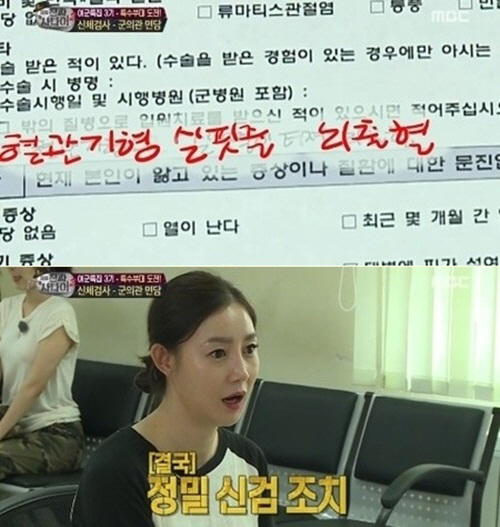 과거 혈관 기형으로 뇌출혈 수술을 받은 박규리는 이날 신체검사를 받으며 "1년에 한 번씩 검진을 받고 있다"고 고백했다. 그녀는 결국 정밀 신검을 받게 됐다.