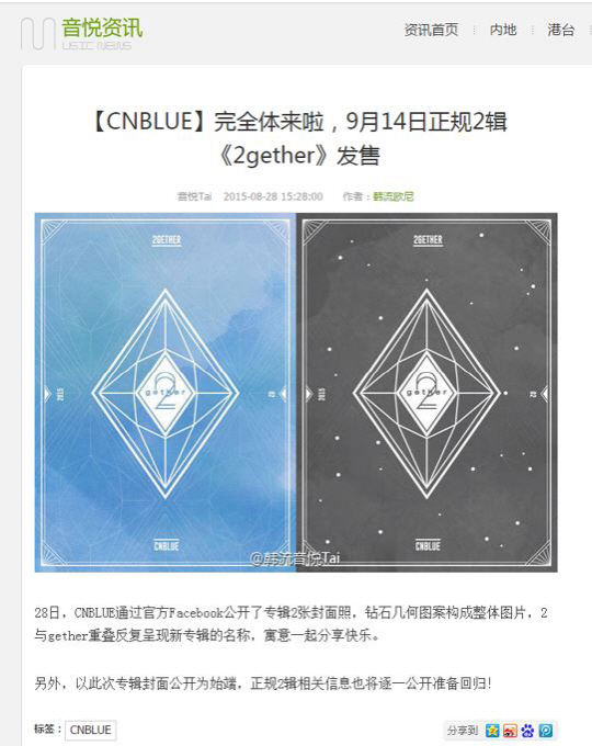 한편 씨엔블루는 28일 씨엔블루 공식 페이스북(https://www.facebook.com/CNBLUEOfficial)에 2집을 의미하는 숫자 '2'와 '함께'를 뜻하는 '투게더(together)'의 합성어인 '투게더(2gether)'가 명시된 두 장의 2집 재킷 커버를 공개했으며 본격적인 컴백 준비에 박차를 가할 예정이다.