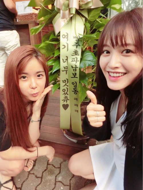 공개된 사진 속 조현영과 김재경은 축하 화환 앞에서 귀여운 포즈를 취하고 있다.