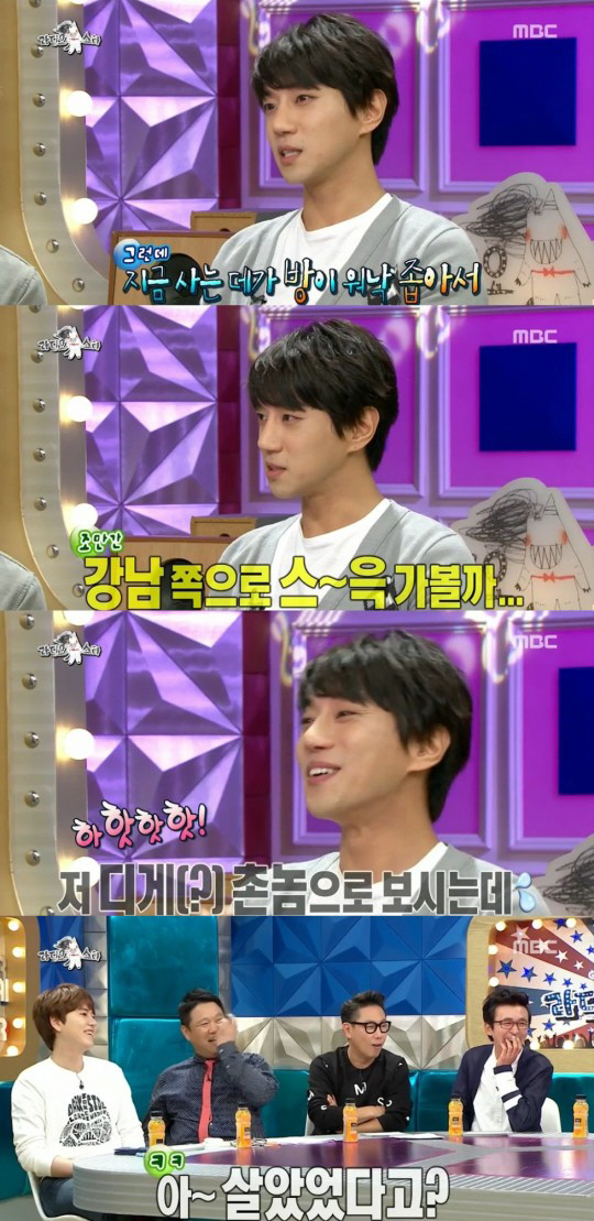 이어 황치열은 "지금 사는데가 방이 워낙 좁아서 강남 쪽으로 쓱 가볼까"라며 이사할 생각이 있다고 밝히자, 김구라는 "바로 강남 가면 부담되지 않냐"며 말했다.