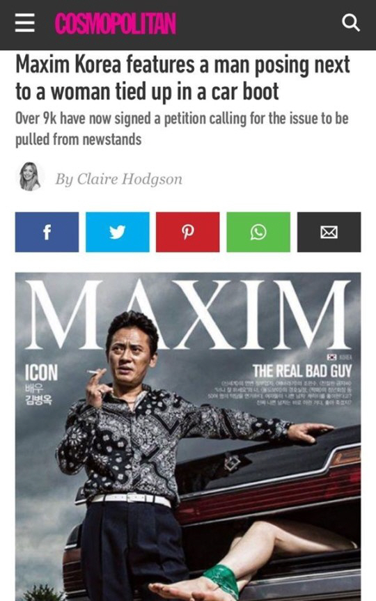 '코스모폴리탄UK'는 "맥심 표지는 너무나 많은 것들이 잘못돼 있다"며 "여성 폭력을 미화하고, 나쁜 남자와 범죄자의 차이를 모호하게 만든다"고 지적하며 전량 리콜과 간행물윤리위원회 공식입장을 요구했다.