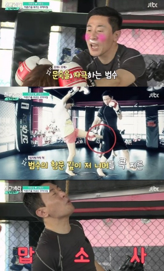 이후 두 사람은 잽과 로우킥 등을 배운 뒤 옥타곤 가운데서 마주섰고, 가벼운 펀치로 부부애를 자랑했다. 그러나 부부애도 잠시 키가 큰 김범수가 안문숙의 머리를 누르며 계속 깐족거리자, 안문숙은 눈빛을 바꾸고 덤벼들었다.
