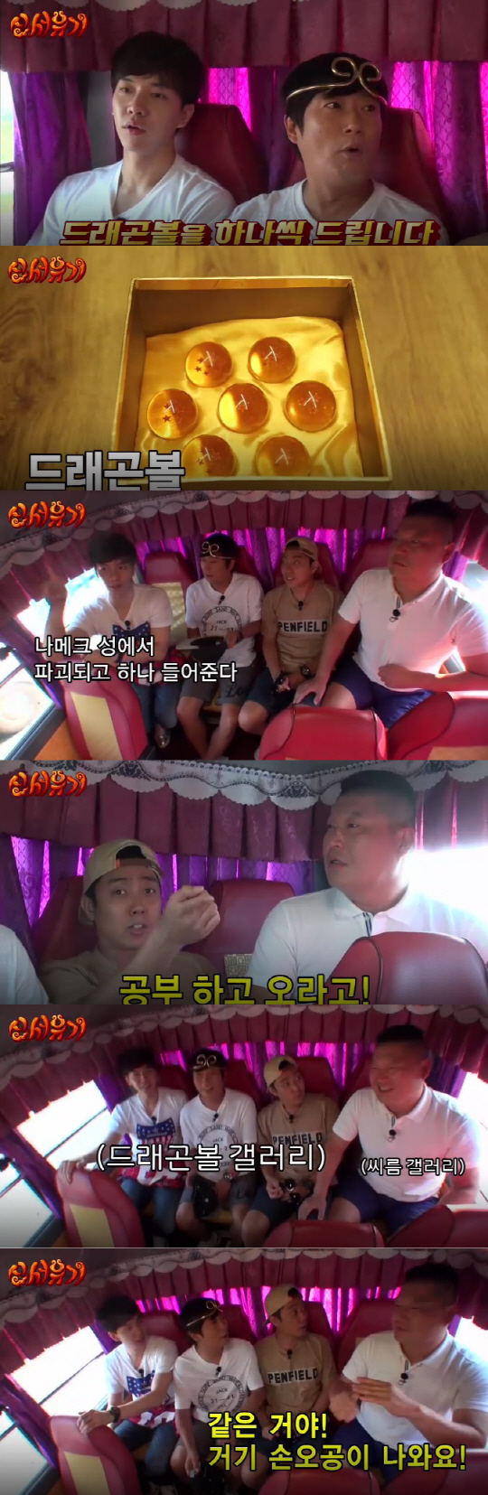 이에 강호동이 잘 알아듣지 못하자 은지원은 "공부 좀 하고 와라"며 강호동에게 호통을 쳤다. 쩔쩔 매던 강호동은 "드래곤볼과 서유기는 만나선 안되는 거다"고 하자 다른 멤버들은 "같은 거다. 다 손오공이 나온다"고 큰형을 타박해 웃음을 자아냈다.
