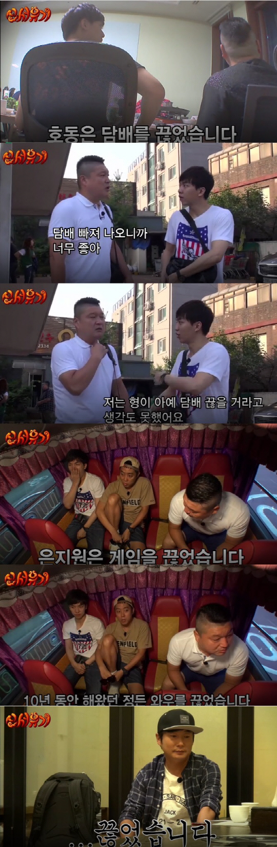 3일 공개된 tvN 디지털 컨텐츠 '신서유기'에서는 중국 심천으로 여행을 떠나는 강호동·이수근·은지원·이승기의 모습이 그려졌다. 이날 강호동은 담배를 끊었다고 밝혀 눈길을 끌었다. 이에 이승기는 "형이 담배를 끊을 줄 몰랐다"며 놀라워했고 강호동은 "너무 좋다. 다른 세상이다"고 말했다. '게임 중독'으로 유명한 은지원은 게임을 끊었다고 했다. 10년동안 해왔던 온라인 게임 와우를 끊었다고 밝혀 제작진을 놀라게 만들었다.은지원의 게임 이야기 후 화면에는 이수근이 모습이 잡혔다. 이어 ",,,끊었습니다"라는 자막이 입혀져 웃음을 자아냈다. 이는 불법도박으로 물의를 빚었던 이수근을 저격한 자막이다.