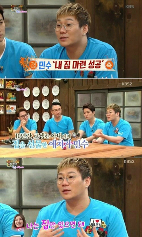 이날 윤민수는 "최근 전세 구하기가 어려워 무리해서 집을 마련했다. 집 명의는 공동명의다"는 소식을 알렸다. 윤민수는 "아내가 집만 있으면 된다고 하더라. 내가 나가서 무슨 일을 해도 된다고 까지 말했다"고 말해 웃음을 안겼다.