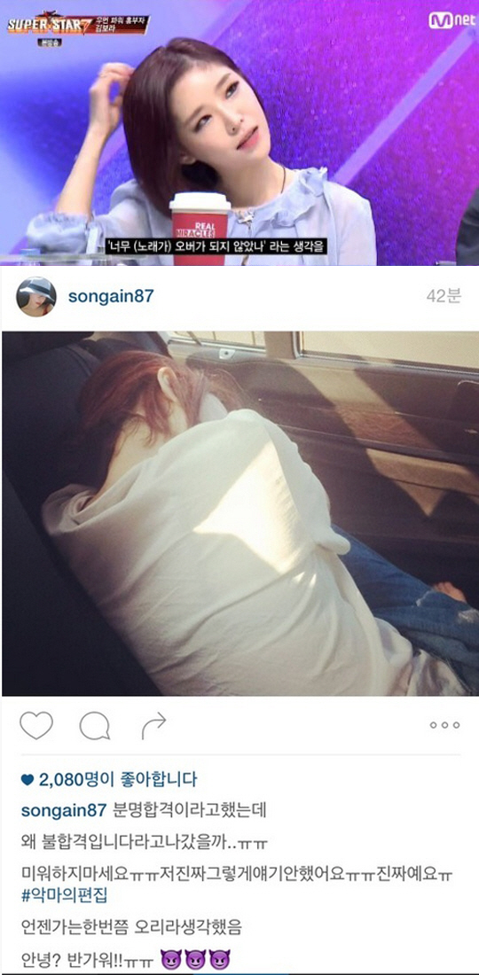 가인은 3일 방송된 슈퍼스타K7 3화에서 임예송 참가자에게 '비염 느낌'이라며 불합격을 준 것처럼 방송됐다. 하지만 가인은 4일 자신의 인스타그램에 "분명 합격이라고 했는데 왜 불합격입니다로 나갔을까. 미워하지 마세요. 저 진짜 그렇게 얘기 안했어요. 진짜예요"라는 글을 남기며 '악마의 편집'이라는 해시태그를 더했다.