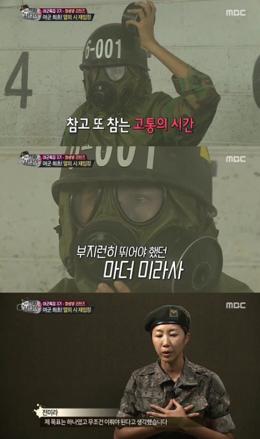 6일 방송된 '진짜 사나이'에서 전미라의 근성과 성실성은 유난히 돋보였다. 그 독한 화생방 훈련도 홀로 이겨냈다. 같은 조에 속한 김현숙, 제시, 유진, 한채아가 고통에 몸부림 치다 끝내 문을 박차고 나갔지만, 전미라는 의지하던 전우들도 없는 상황에서 묵묵히 훈련을 마쳤다. 화생방실을 나간 뒤에도 흐트러지지 않는 자세를 유지했다.