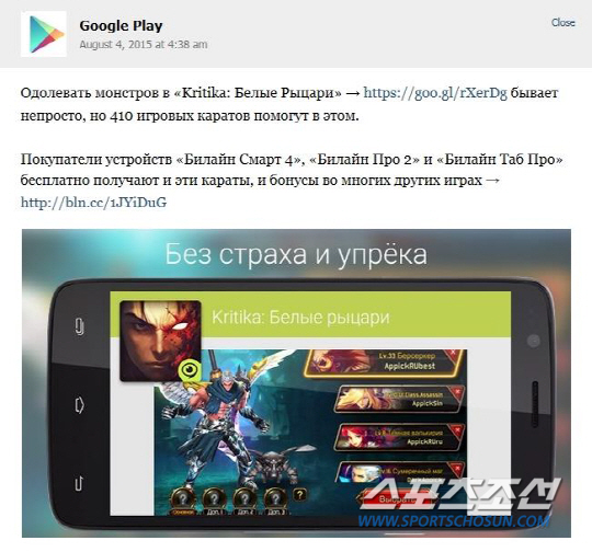 특히 러시아 3대 이동통신사인 비라인을 통해 구글 쿠폰을 대대적으로 제공하면서 현지 고객들을 상대로 인기 몰이에 나선 점이 주목된다. 이미 '크리티카: 천상의 기사단'은 리투아니아의 구글 플레이 게임 전체 매출 4위, 게임 내 장르 매출 1위에 올랐을 정도로 동유럽 시장에서도 인기 게임으로 통한다. 현재 이 게임은 리투아니아, 크로아티아 등 동유럽권을 포함, 전세계 30여 개 국가의 구글 플레이 게임 장르 매출 TOP 10을 고수하고 있다. 남정석 기자 bluesky@sportschosun.com