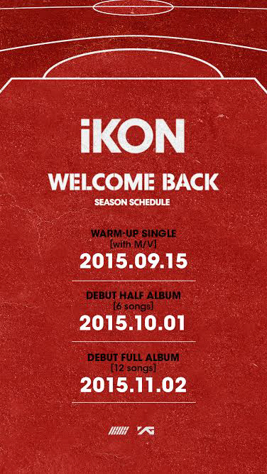 YG는 8일 공식블로그(www.yg-life.com)를 통해 'iKON - WELCOME BACK : SEASON SCHEDULE'이라는 타이틀로 포스터를 게재하며 아이콘의 데뷔 시즌 스케줄을 알렸다. 포스터에는 아이콘의 데뷔 앨범 제목인 'WELCOME BACK'이 공개됐으며 'SEASON SCHEDULE'이란 문구와 함께 구체적인 스케줄이 명시됐다. 이에 따르면 우선 아이콘은 오는 15일 선공개곡과 뮤직비디오를 함께 공개한다. 이는 지난 7월 말 양현석 대표 프로듀서가 직접 언급했던 아이콘의 데뷔 날짜이기도 하다.
