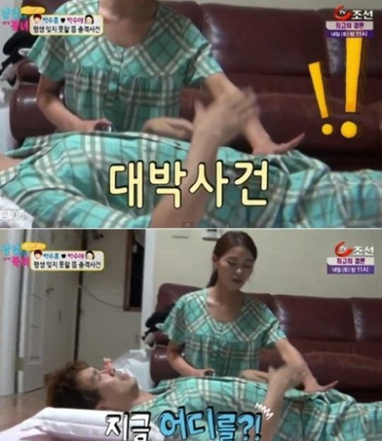 지난 6월 남남북녀 방송 당시 박수애는 남편 박수홍을 위해 뜸뜨기에 나섰다. 박수애는 박수홍의 배에 뜸을 뜨기 위해 눕힌 뒤 배에 손을 올려놓았다.