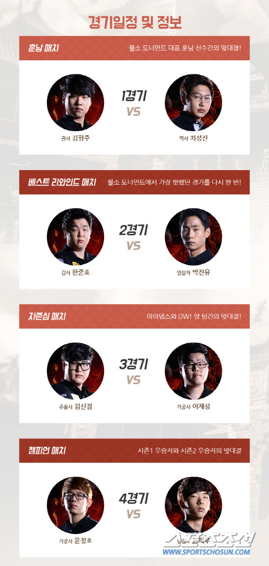 경기는 훈남 매치 : 김형주(권사) 대 최성진(역사), 베스트 리와인드(rewind) 매치 : 한준호(검사) 대 박진유(암살자), 자존심 매치 : 김신겸(주술사) 대 이재성(기공사), 챔피언 매치 - 시즌1 우승자와 시즌2 우승자의 대결 : 윤정호(기공사) 대 권혁우(린검사) 순으로 진행된다.