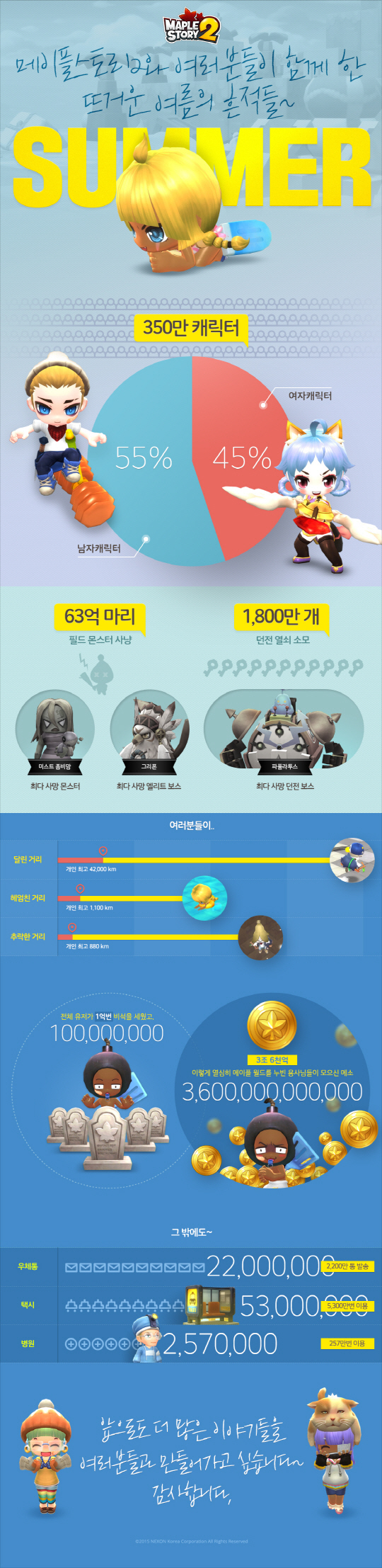 넥슨은 '메이플스토리2'가 정식 서비스를 시작한 이후 2개월여간의 기록을 담은 인포그래픽을 11일 공개했다. 2개월동안 350만 캐릭터가 생성됐고 63억마리의 필드 몬스터 사냥이 이뤄졌다. 남정석 기자 bluesky@sportschosun.com