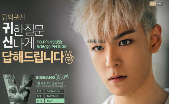 이를 앞두고 11일 오후 오픈된 탑의 V앱 개인방송 페이지에는 '탑의 귀신: 귀한 질문 신나게 답해드립니다'라는 방송 콘셉트가 공개돼 눈길을 끈다. 이번 방송에서 탑은 팬들의 다양한 궁금증들을 시원하게 해소해주며 팬들과 한층 더 가까이 소통할 것으로 기대를 모은다.