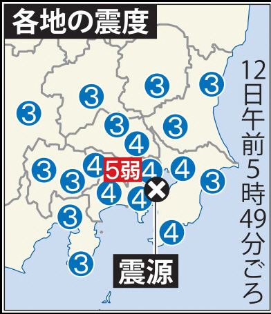 이 지진으로 도쿄도(東京都) 조후(調布) 시에서 진도 5에 육박하는 흔들림이 감지됐고 도쿄도 기타 지역과 그 주변 넓은 지역에서 진도 3∼4가 관측됐다.