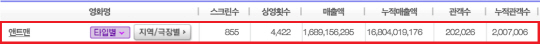 12일 영진위 입장권 통합전산망 집계에 따르면 '앤트맨'은 오후 4시 48분 기준, 누적 관객수 2,007,006명을 기록하며 200만 관객을 돌파했다. 이는 마블의 전작 중 개봉 11일째 200만 명을 돌파한 '캡틴 아메리카: 윈터 솔져', 개봉 12일째 200만 관객을 달성한 '토르: 다크 월드'를 앞서는 수치로 마블의 새로운 히어로 '앤트맨'이 시간이 지날수록 높은 인기를 얻고 있다는 것을 실감하게 한다.