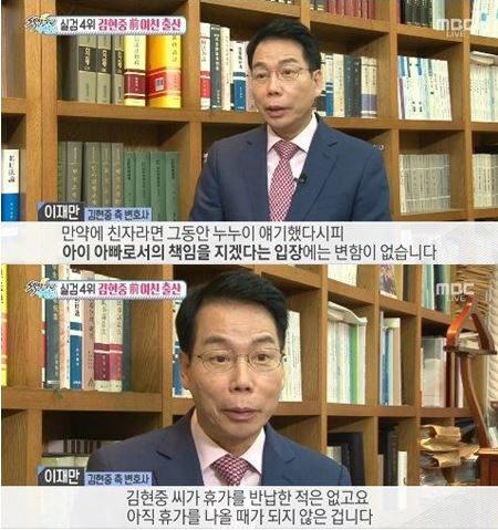 13일 방송된 MBC '섹션TV 연예통신'에서 김현중 측 이재만 변호사는 "보도를 통해 김현중 전 여자친구의 출산 사실을 알게 됐다. 출산 전후로 출산 관련 이야기를 전혀 전달받지 못했다"고 밝혔다.
