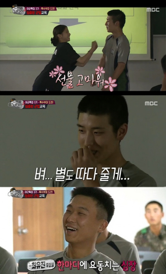 이어 각종 군법에 대해 배우던 중 최유진은 한 훈련병의 여자친구 역을 맡아 군보급품을 선물을 받는 상황극을 선보였다.