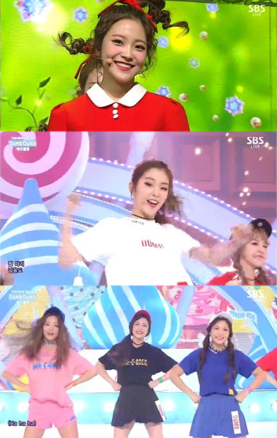 레드벨벳은 13일 방송된 SBS '인기가요'에 출연해 첫 정규앨범 수록곡 'Huff N Puff'와 타이틀곡 'Dumb Dumb'을 무대를 꾸몄다.