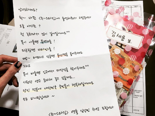 김새롬은 "열심히 해야지"라고 적은 뒤 PD가 쓴 "출연해 주셔서 고맙습니다. 첫 녹화라서 많이 길어질거에요. 목이 아플 땐 목캔디 피곤할 땐 비타민C를 빵 터지고 싶을 땐 풍선껌을 불어주세요"라고 정성스레 쓴 편지를 공개했다.
