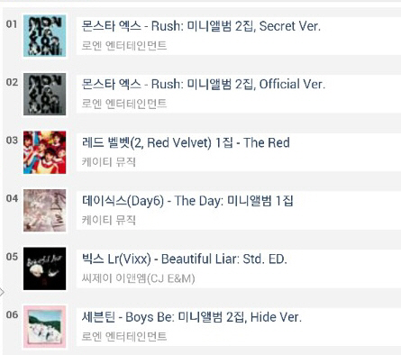 몬스타엑스의 두 번째 미니앨범 [RUSH(러쉬)]가 14일 한터차트 1위에 등극하는 기염을 토했다.