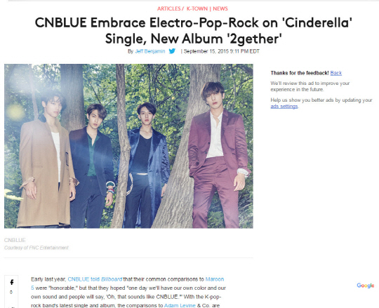 빌보드는 지난 15일(이하 현지시각) K-POP 칼럼코너 K-TOWN을 통해 '씨엔블루가 신보 '투게더'와 타이틀곡 '신데렐라'에서 일렉트로팝록을 아우르다(CNBLUE Embrace Electro-Pop-Rock on 'Cinderella' Single, New Album '2gether')'라는 제목의 칼럼을 게재했다.