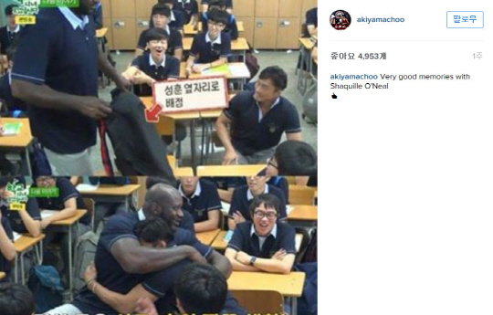 한편 지난 주 추성훈은 자신의 인스타그램에 "Very good memories with Shaquille O'Neal(샤킬오닐과 만남은 좋은 추억이였다)"라는 글과 함께 샤킬오닐과의 처음 만났던 방송 장면을 캡처해 게재해 눈길을 끌었다. <스포츠조선닷컴>