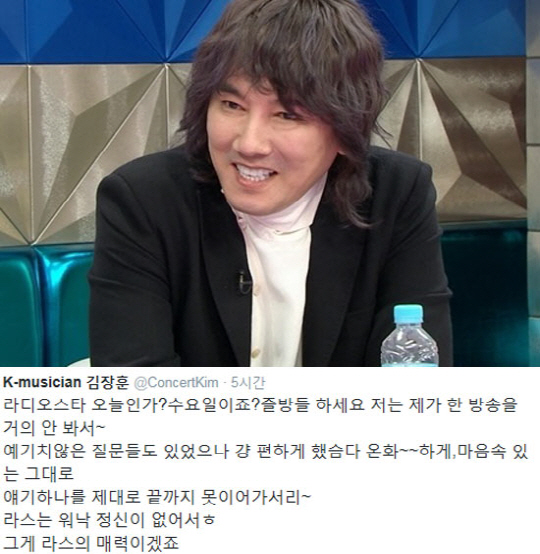 16일 김장훈은 자신의 트위터에 "라디오스타 오늘인가? 수요일이죠? 즐방들 하세요"라며, "저는 제가 한 방송을 거의 안 봐서~ 예기치않은 질문들도 있었으나 걍 편하게 했슴다. 온화~~하게 마음속 있는 그대로 얘기하나를 제대로 끝까지 못이어가서리~ 라스는 워낙 정신이 없어서 그게 라스의 매력이겠죠"라는 글을 게재했다.