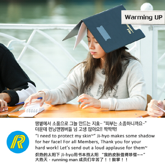 '런닝맨 워밍업'이라는 이름으로 공개된 사진에는, 20일 방송 예정인 런닝맨 촬영장에서 여배우 송지효의 피부 보호법이 포착됐다.