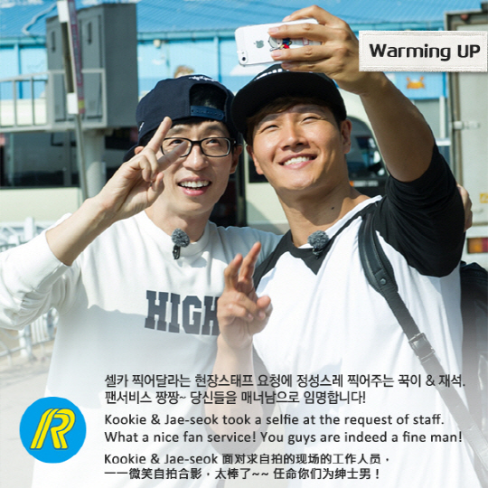 이날 공개된 사진에는 매너손 규현 외에도, 카메라 밖에서도 여신의 포스를 뽐내는 홍일점 송지효와 스태프의 요청에 정성스레 셀카를 찍어주는 유재석, 김종국의 리얼 팬서비스 현장 등 다양한 비하인드 스토리가 담겨있으며, 다양한 촬영현장 모습을 담은 [런닝맨 워밍업]은 앞으로 매주 수요일 런닝맨 공식 페이스북 계정(gorunningman)을 통해 만나볼 수 있다.